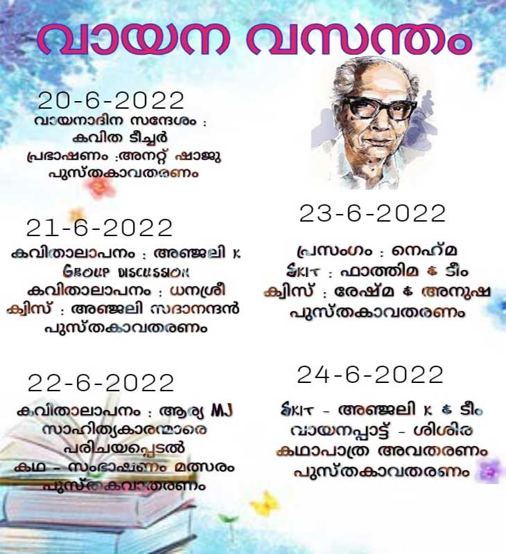 വായനാ വാരത്തോടനുബന്ധിച്ച് എസ്.എൻ ടി.ടി.ഐ ലെ ഈ അധ്യയന വർഷത്തെ അധ്യാപക വിദ്യാർത്ഥികളുടെ നേതൃത്വത്തിൽ "വായന വസന്തം" നു വർണാഭമായ തുടക്കം. 5 ദിവസം നീണ്ടു നിൽക്കുന്ന പരിപാടികളാണ് വായന വസന്തത്തിൽ ഉണ്ടായിരിക്കുക.